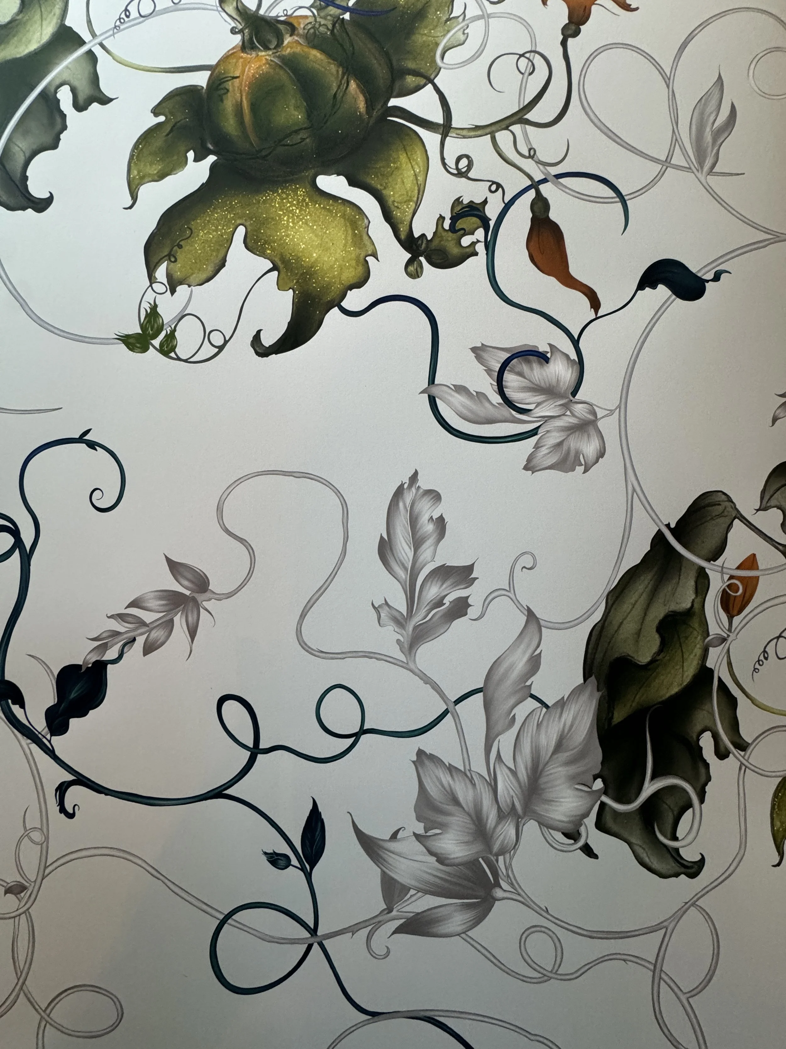 In honor of Winnie’s ex-lover, “Billy’s Revenge” wallpaper features a dense pattern of heavily vined pumpkins and twisting tendrils rendered in muted cemetery grays, evoking an eerie yet elegant atmosphere. A single blue vine serves as a connecting thread to the full wallpaper suite.