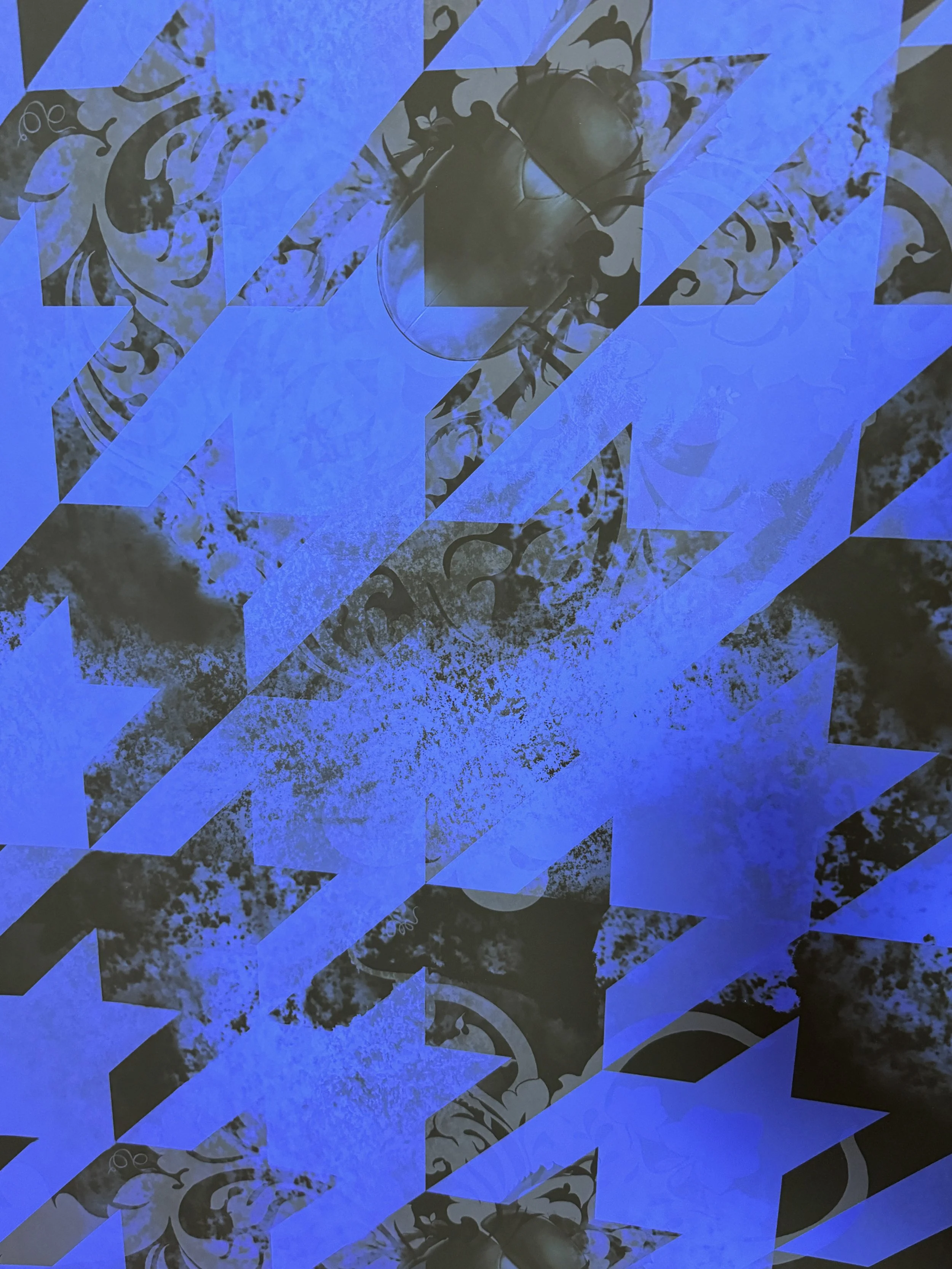 An elegant, worn houndstooth pattern with scarab beetles discreetly embedded within some of the shapes, layered with distressed damask overlays. This fusion of classic textile patterns and occult iconography speaks to the club’s balance of timeless style and dark mystery.