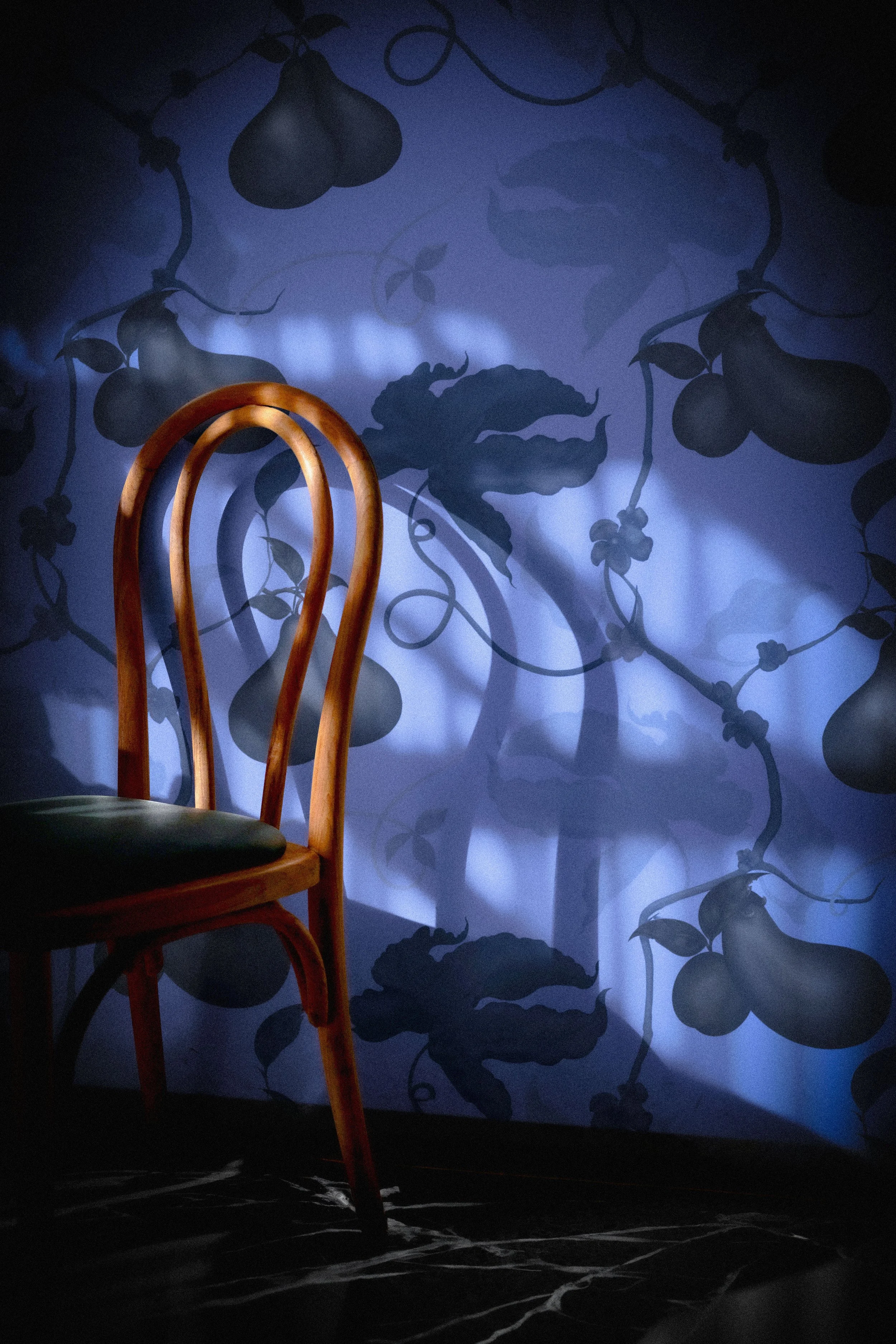 Playful and provocative, this wallpaper riffs on cheeky emoji symbols of seduction – eggplants, plums, and pears – blending whimsy and eroticism in deep, moody tones. It’s the club’s wink to grown-up mischief, where the fruits of temptation are ripe for the taking. Blue vines serve as a common thread, connecting the palettes of each pattern in the club.